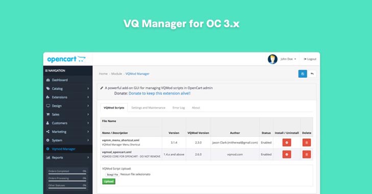 VQMod Manager is an OpenCart 3.x extension which allows you to centrally manage your VQMod scripts (upload, install/uninstall, delete, troubleshoot) from the OpenCart Admin.